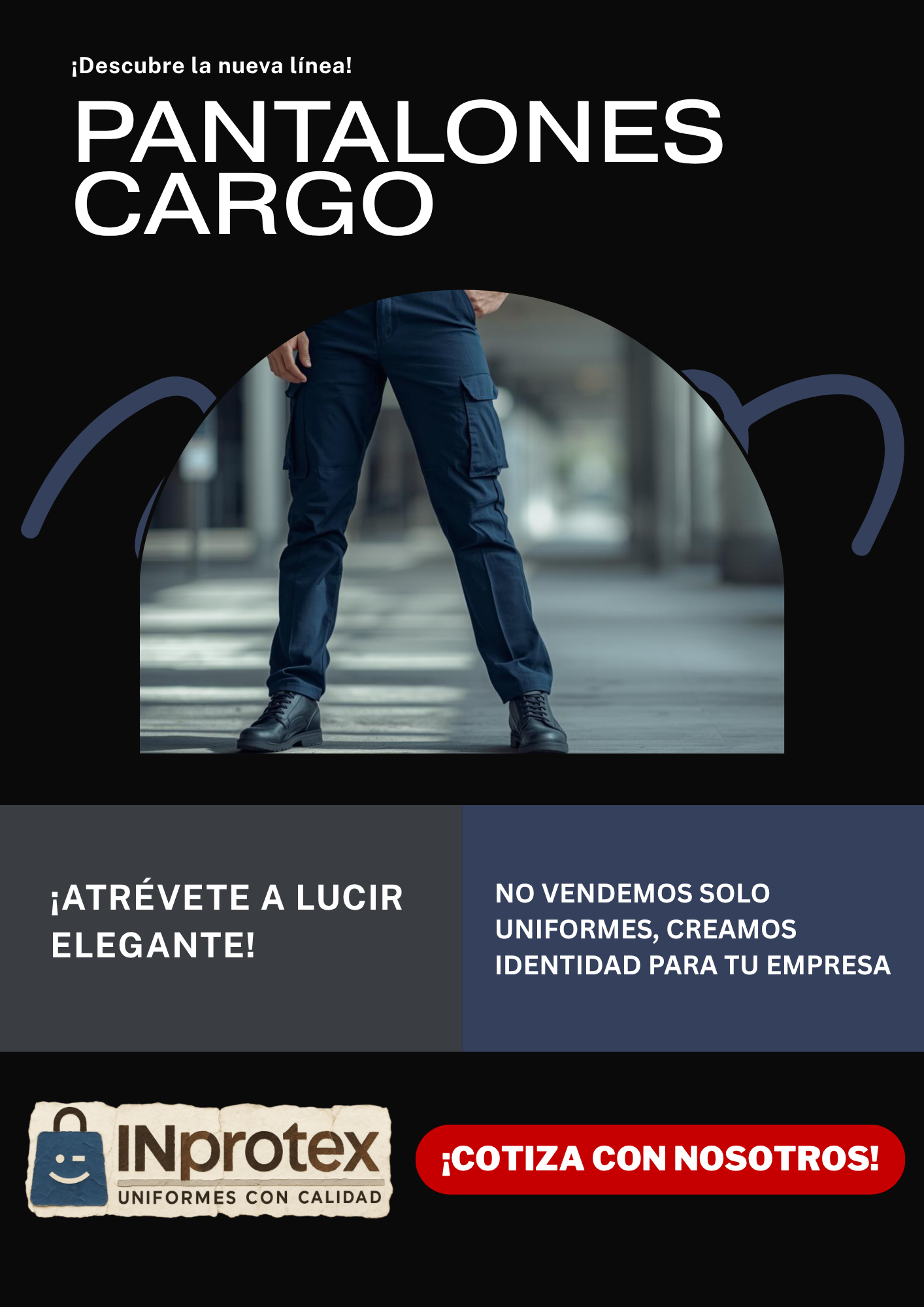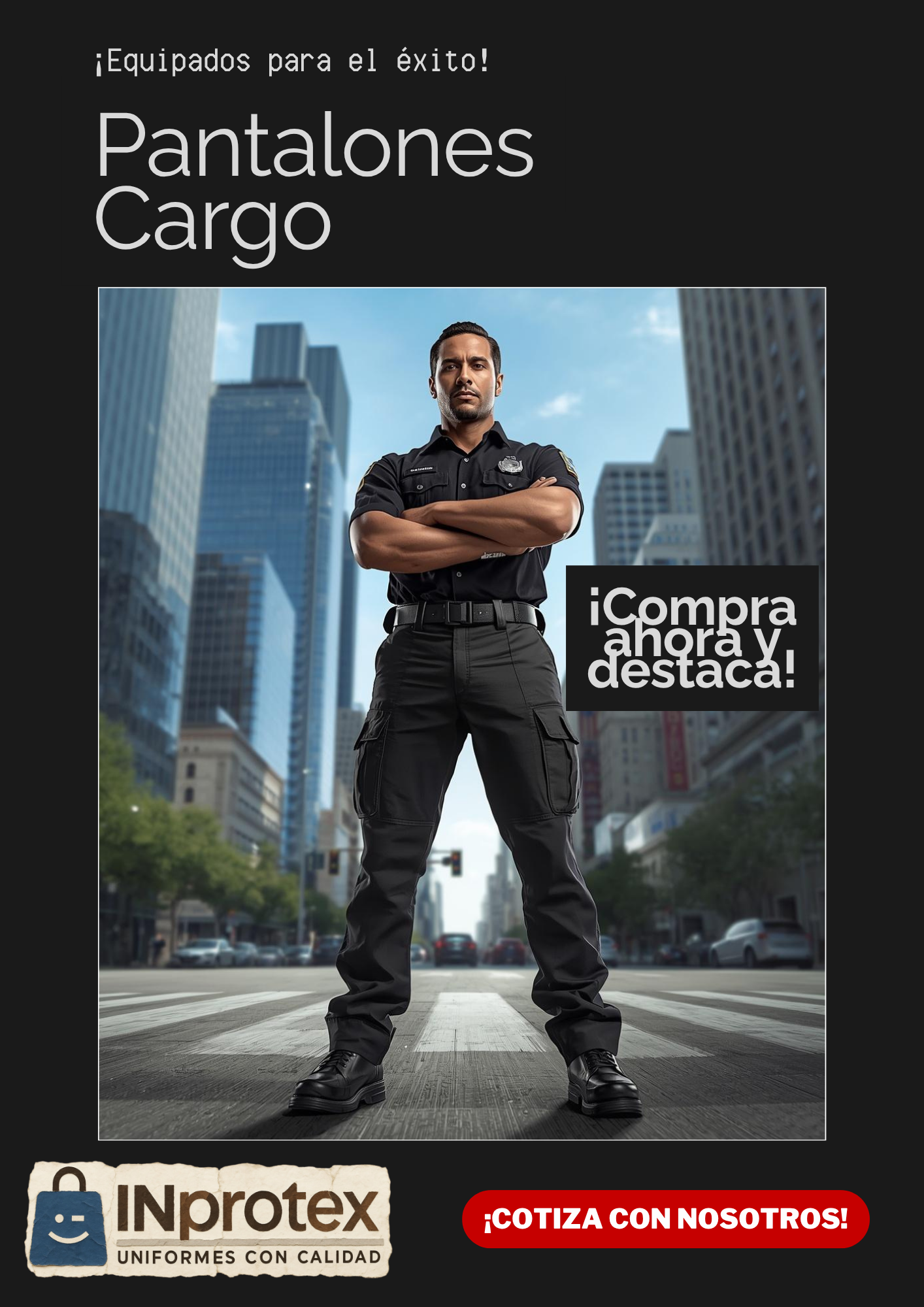 El Pantalón Cargo de Vestir Guardia Seguridad ofrece un diseño funcional con calce recto y seis bolsillos estratégicamente ubicados (dos frontales, dos cargo laterales y dos traseros) para maximizar el almacenamiento. Los seis pasadores permiten el uso de cinturones anchos, asegurando un ajuste firme y cómodo. Las costuras reforzadas en los tiros y la costura de seguridad en la entrepierna brindan durabilidad, especialmente en ambientes de trabajo exigentes. El interior cuenta con finas terminaciones que mejoran el confort y la apariencia. El material en color negro ha sido testeado para garantizar su resistencia ante el sudor y la luz solar, haciendo de este pantalón una opción resistente y fiable.